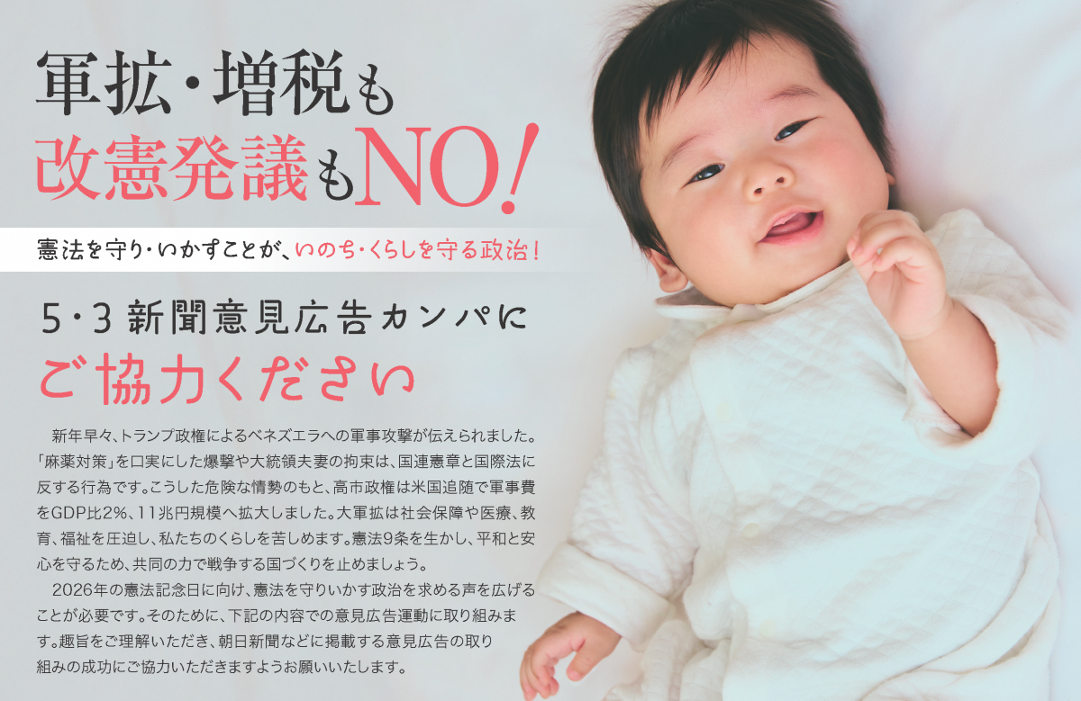 「麻薬対策」を口実にした爆撃や大統領夫妻の拘束は、国連憲章と国際法に反する行為です。こうした危険な情勢のもと、高市政権は米国追随で軍事費をGDP比2%、11兆円規模へ拡大しました。大軍拡は社会保障や医療、教育、福祉を圧迫し、私たちのくらしを苦しめます。憲法9条を生かし、平和と安心を守るため、共同の力で戦争する国づくりを止めましょう。